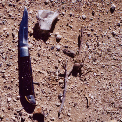 Dad suggested including the knife in this photo to give a better sense of the size of the spider and her egg sac. Pretty sure he learned this trick from the crime scene photos he collected in Japan.